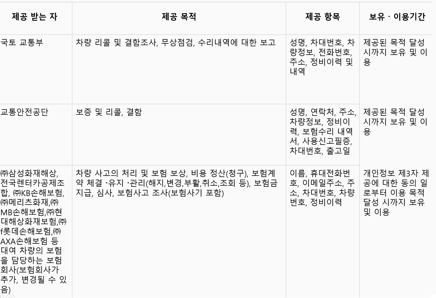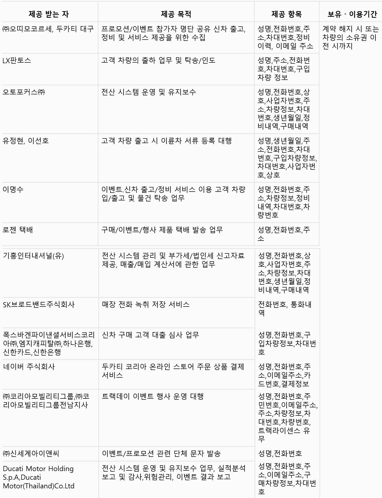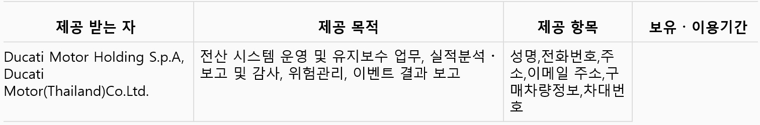 2. 두카티 코리아는 다음과 같이 개인정보를 제3자에게 제공하고 있습니다.