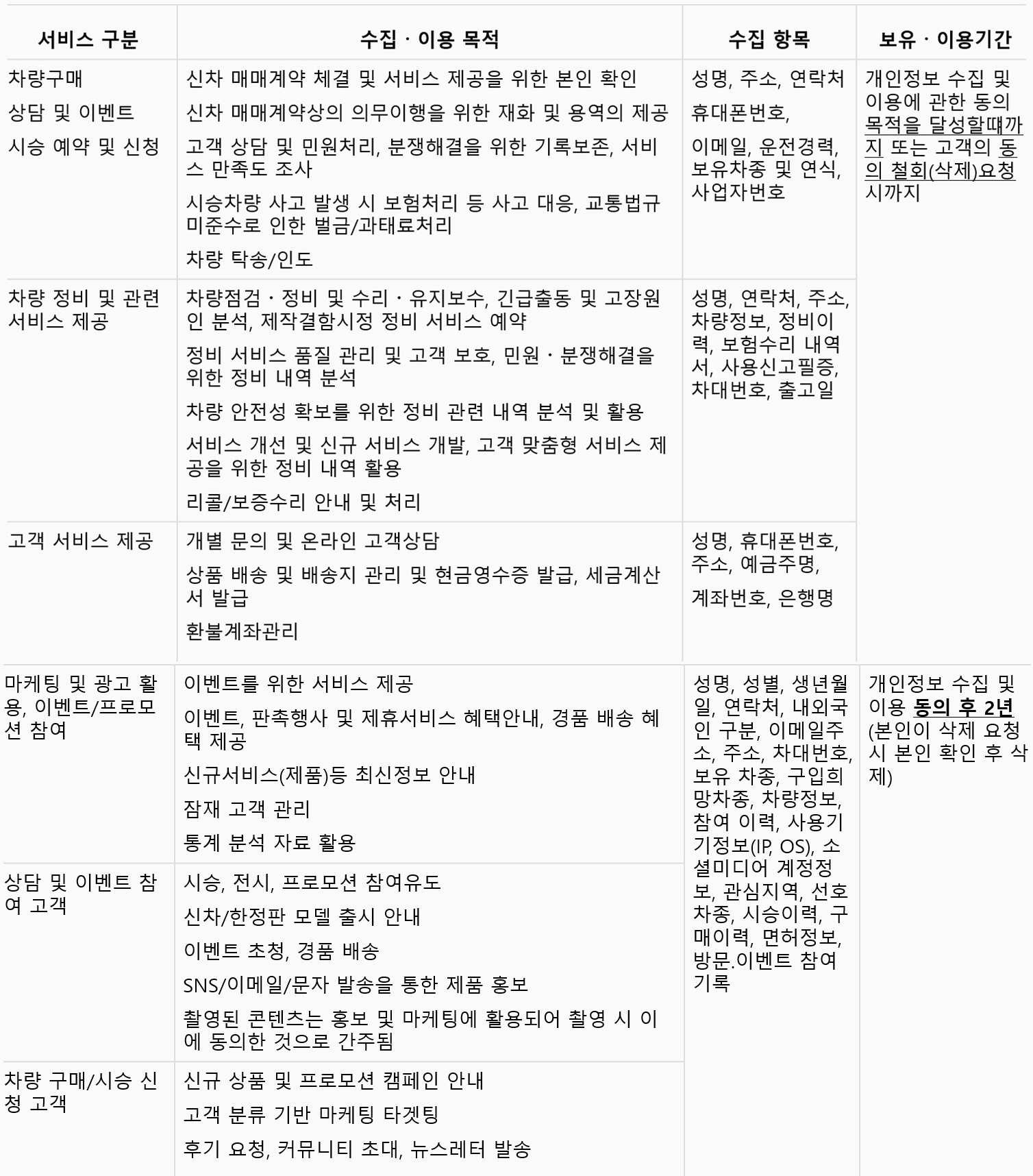 1. 두카티 코리아는 원활한 개인정보 업무처리를 위하여 다음과 같이 개인정보 처리업무를 위탁하고 있습니다.